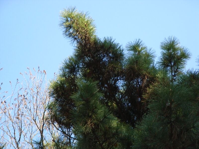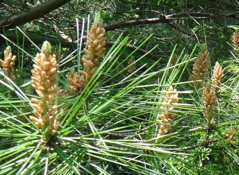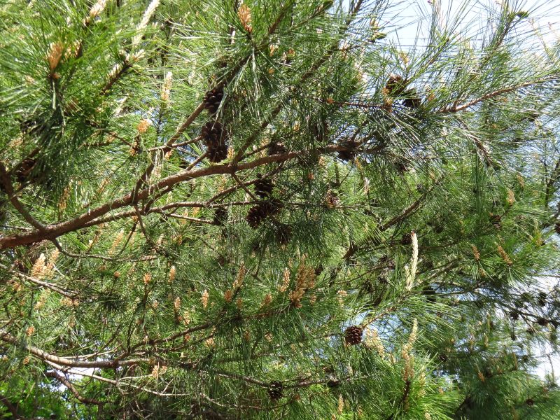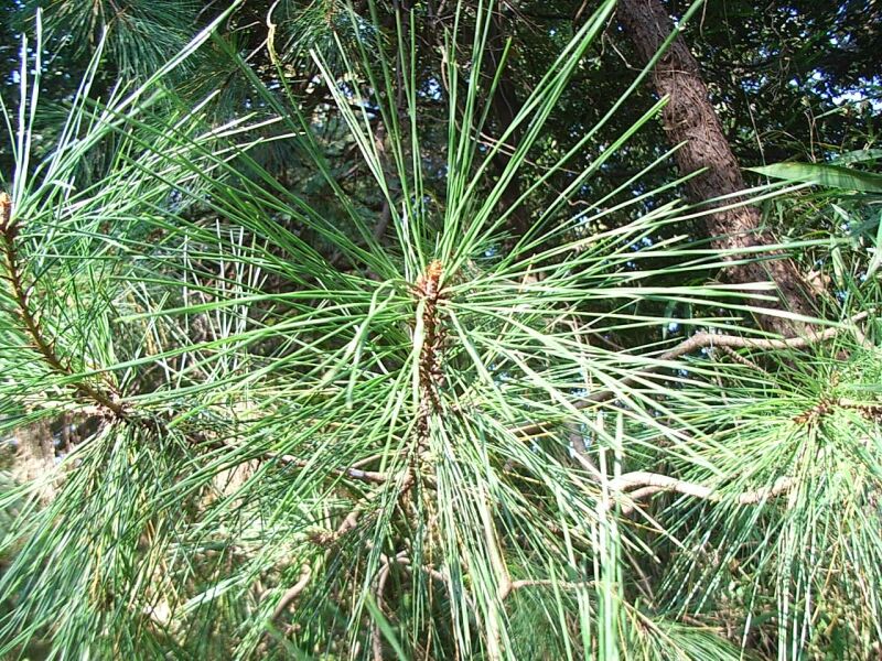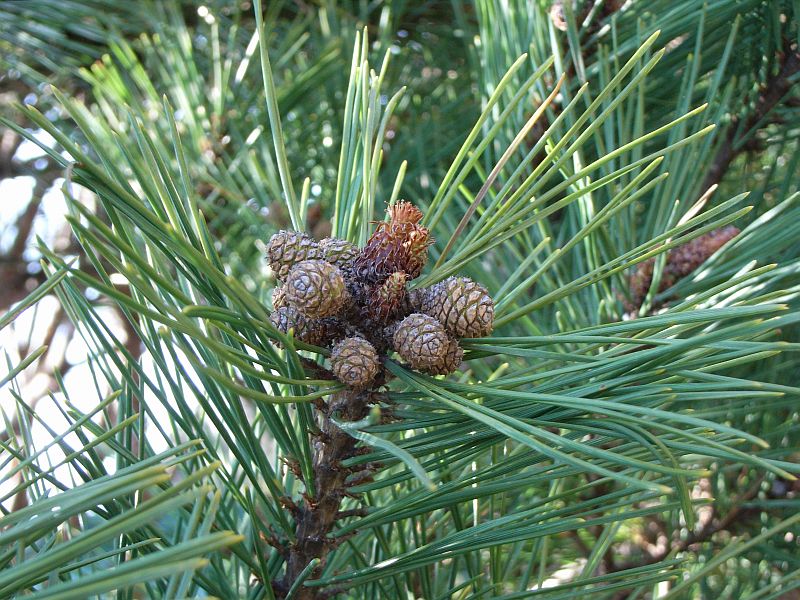 クロマツ:海岸に多い、葉が太い、新芽が白っぽい、幹が黒みを帯び亀甲形の割れ目、松笠6〜8センチ。