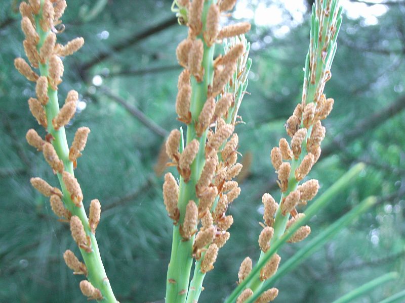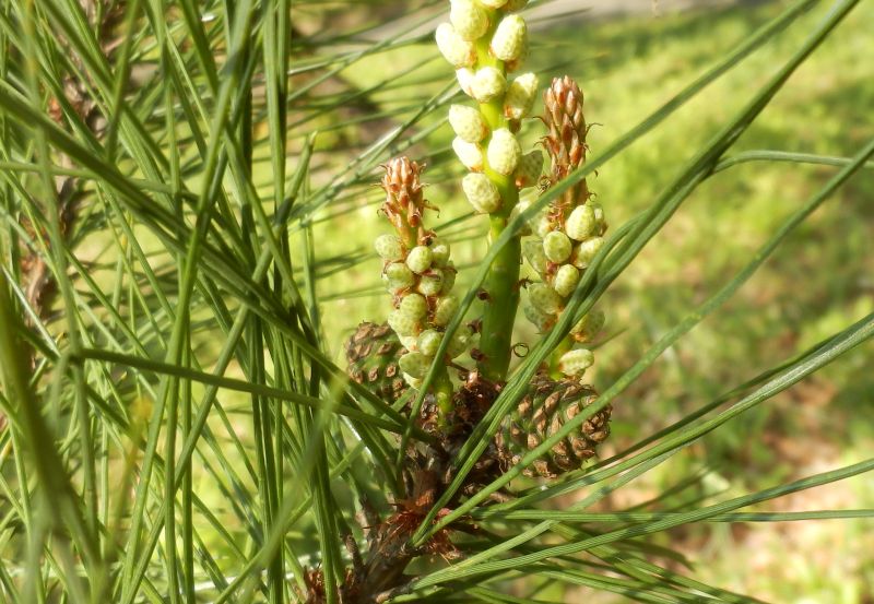 雄花序は淡褐色の長楕円形で、新枝の基部に螺旋状に密生する。