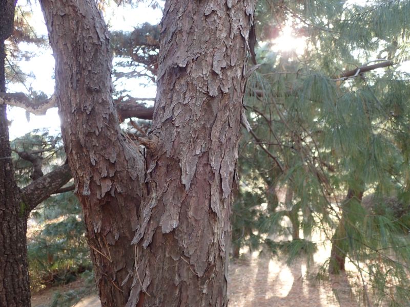 樹皮は赤褐色〜暗灰色で、鱗状に薄く剥がれる。
