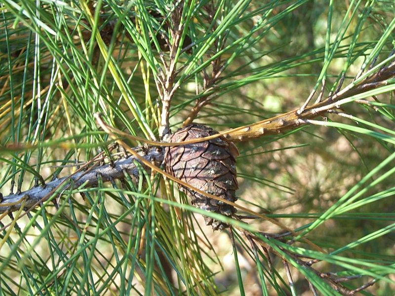 球果は長さ5〜7センチの卵形で、翌年の秋に熟し、種鱗の先は丸く、