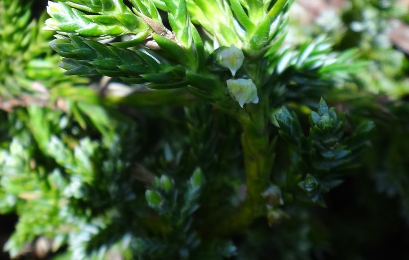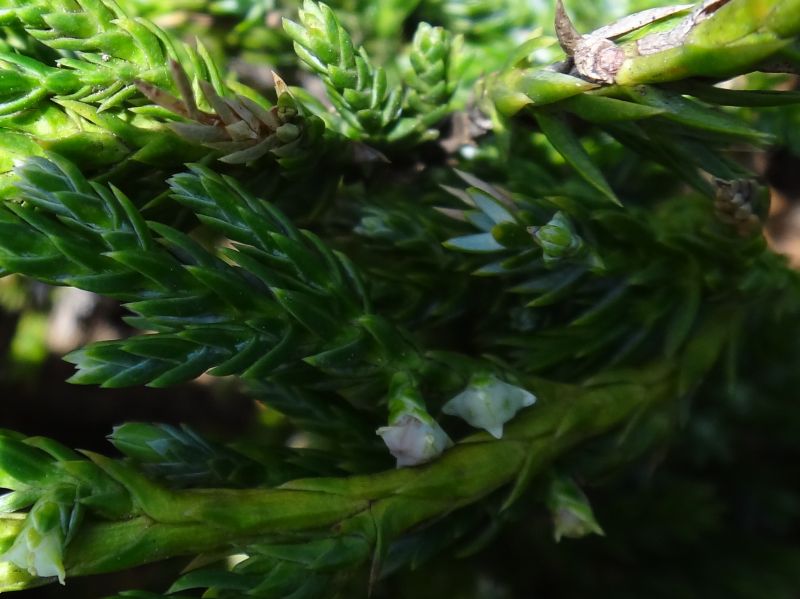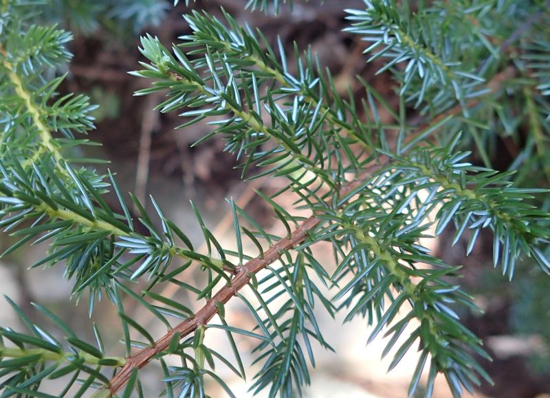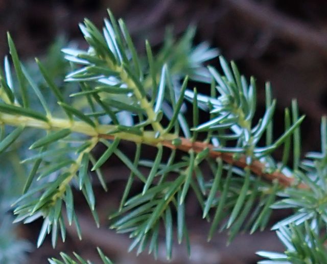 葉は針状で長さ1〜2センチあり、上部では密集し、下部では3輪生する。