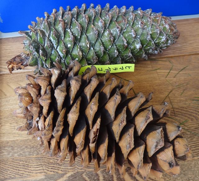 雌花序は翌年の秋に長さ10〜40センチの細長い円錐形の球果となる。