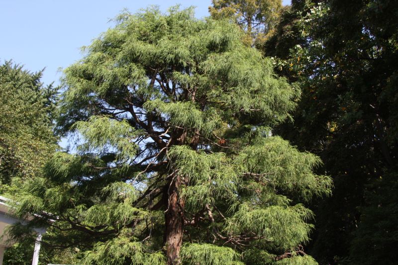 樹形は狭円錐形で、淡黄色の枝葉が密生する