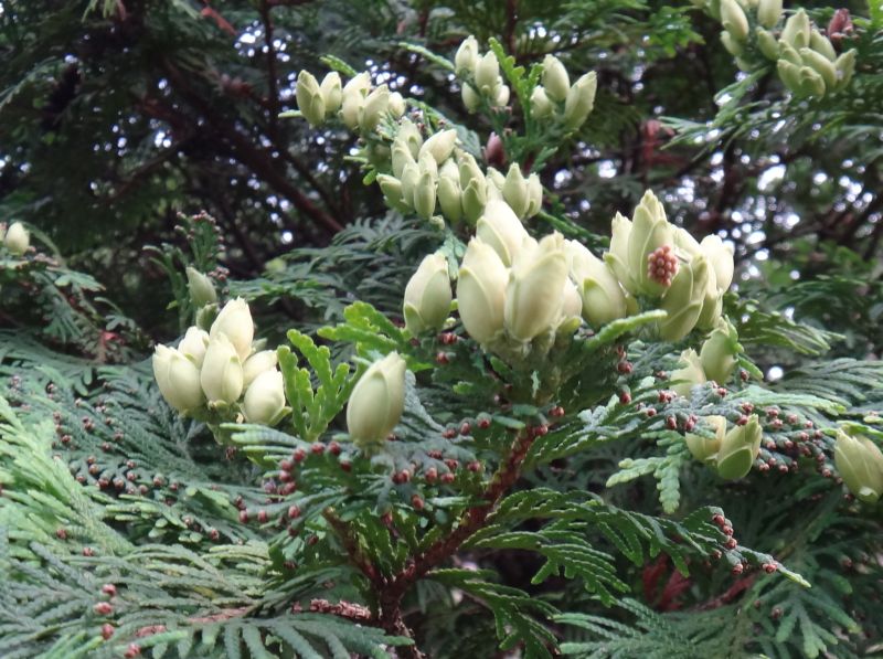 樹形は狭円錐形、葉は鱗片状で、球果は紡錘形で枝先につく