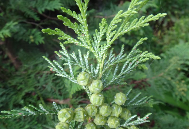 濃緑色の球果をつける