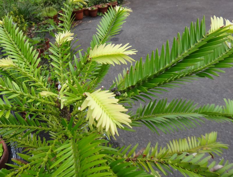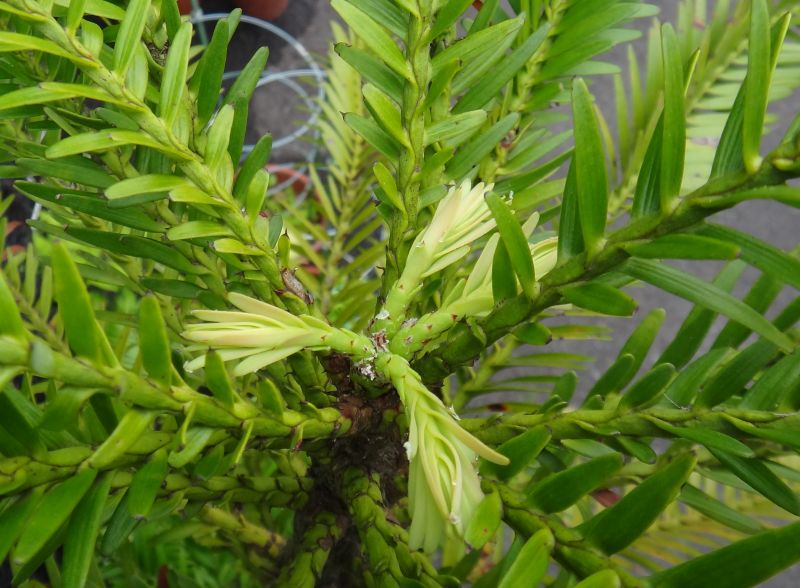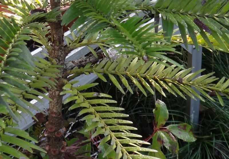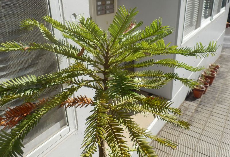 小さな線形の葉が密に並んだ枝が幹から出て、