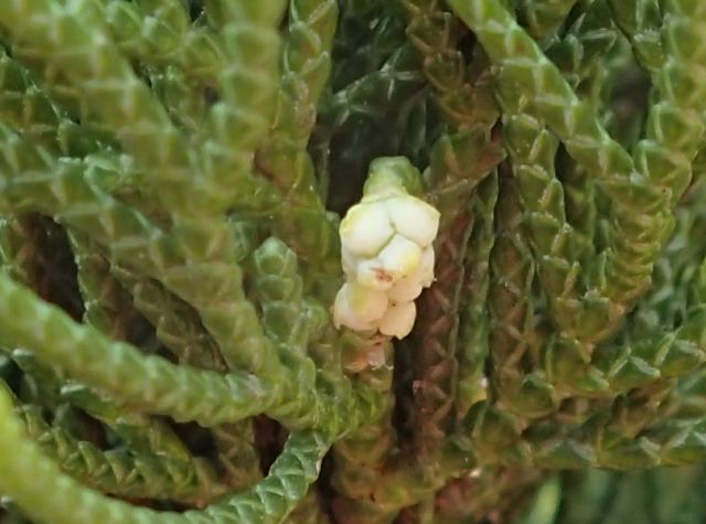 花は白緑色〜淡褐色の肥大した鱗片が丸く集まったような形で、