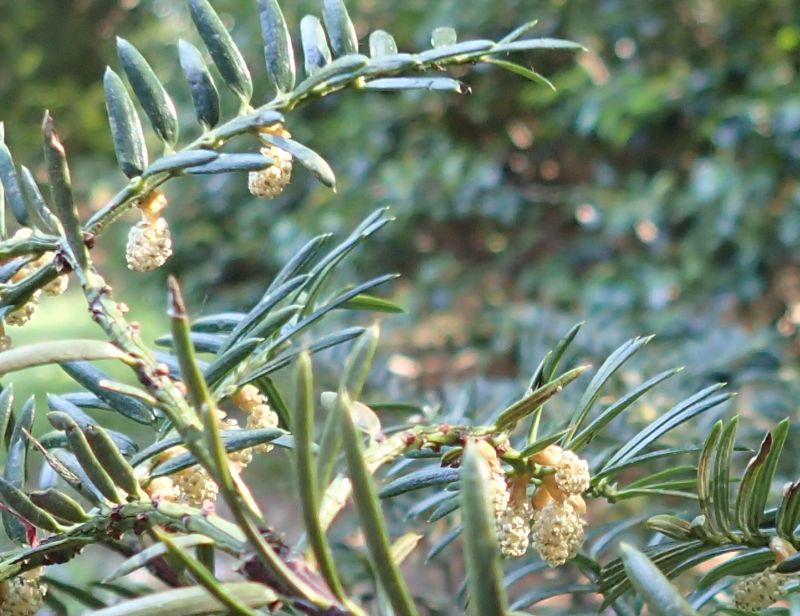雌雄異株であり、花は楕円体で、雄花は黄色で前年の葉腋につき、雌花は緑色で新枝基部の葉腋につく。