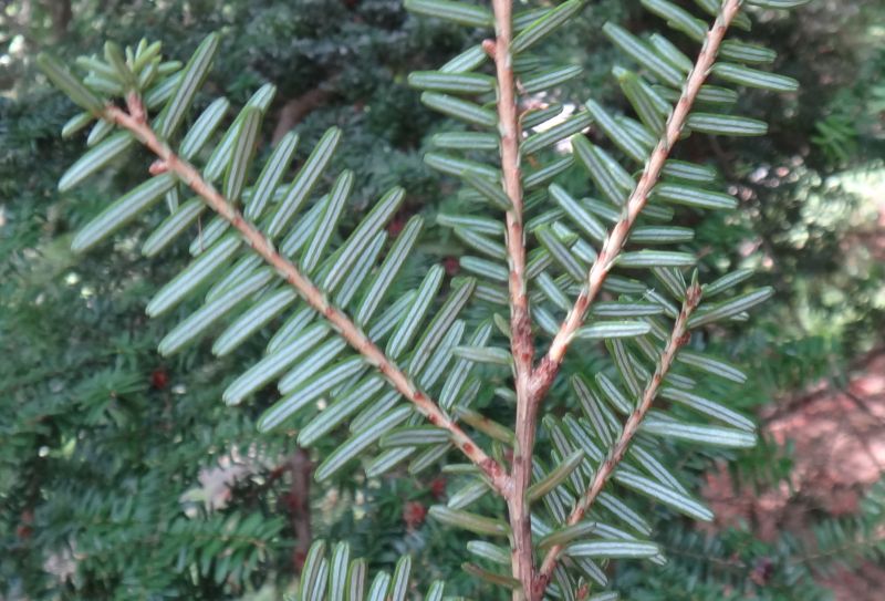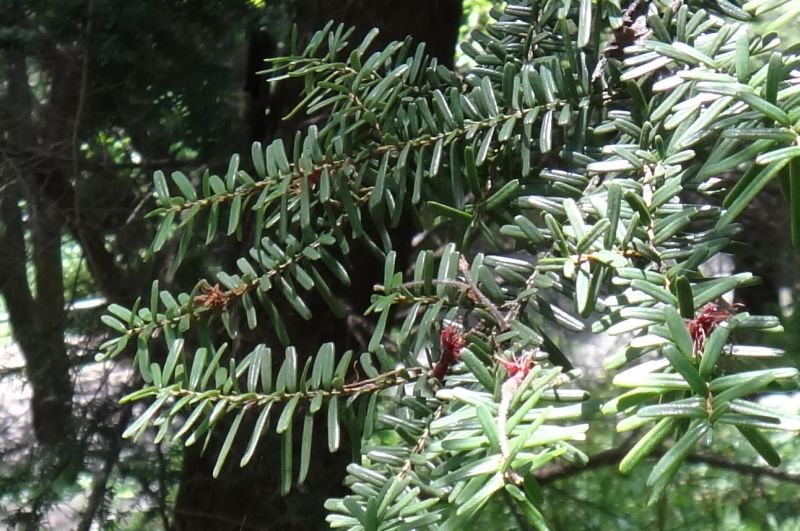 ツガと似ているが、若枝に毛があること、球果が少し小さいこと、