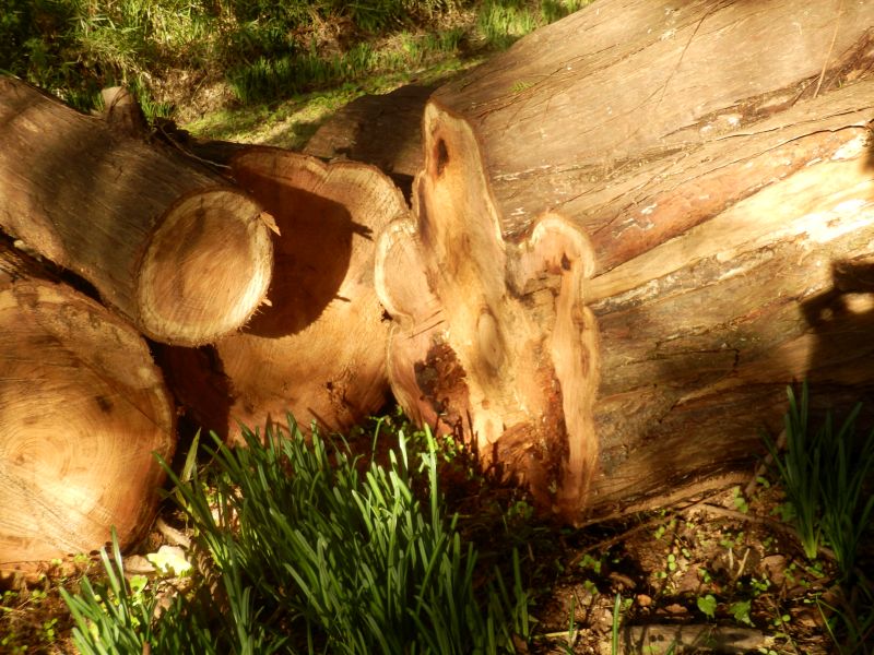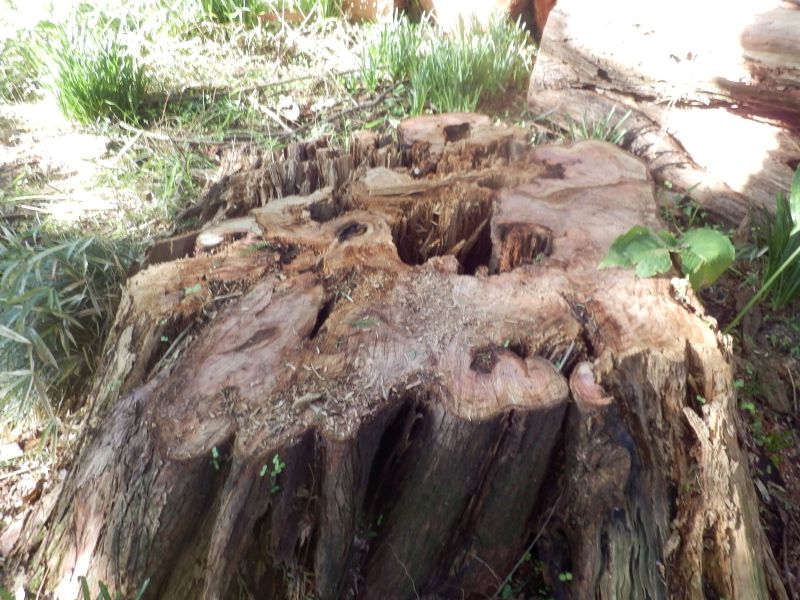 切り株。太い木では、中心部が空洞になっていることが多い。