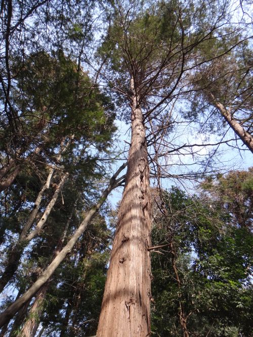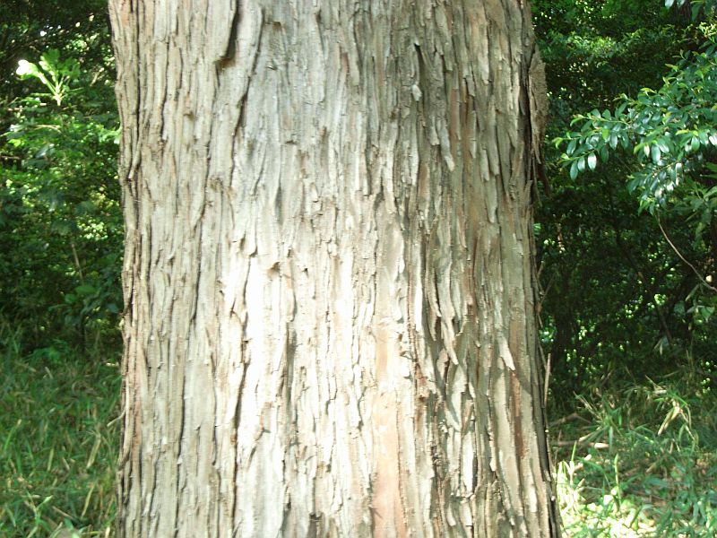 幹は直立し、樹皮は赤褐色で、縦に薄く裂けて剥がれる。