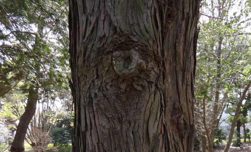 ヒノキアスナロ:葉は幅広で先とがらず、気孔帯が4本、果鱗に突起なく、樹皮の肌理が細かい。