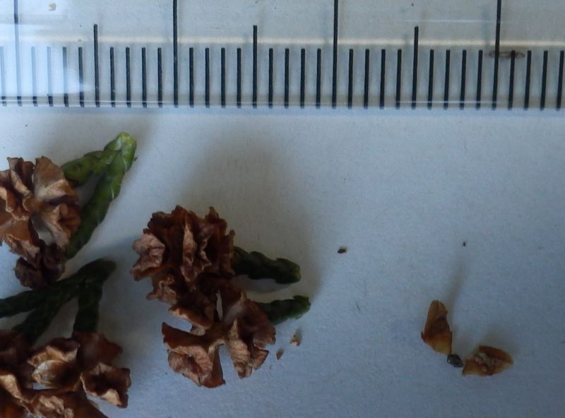 球果は直径5〜6ミリで、空気の抜けたボールのようにあちこち