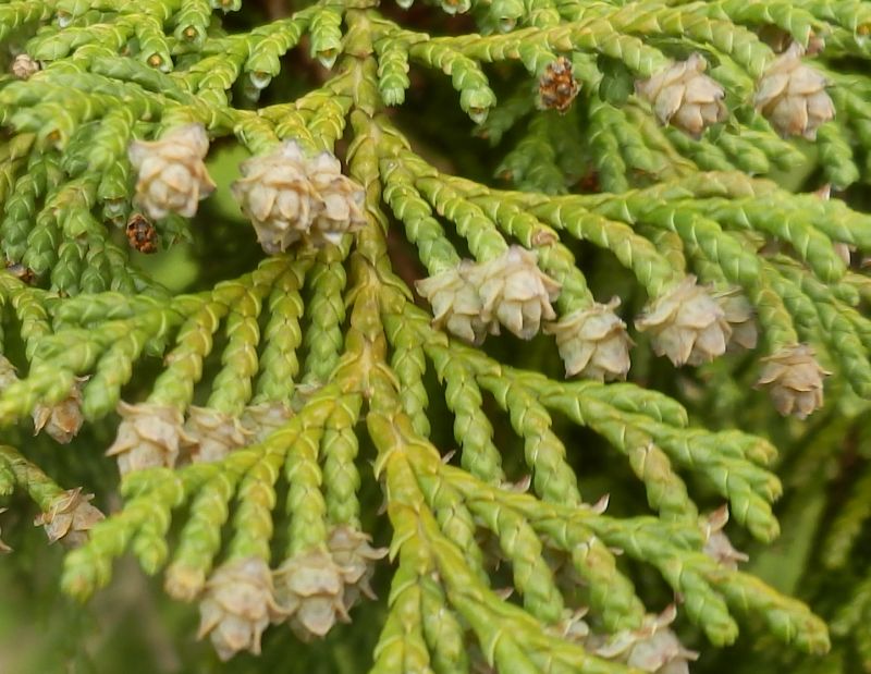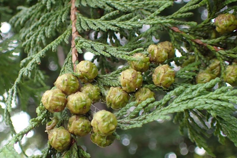 雌花は灰色の球形で鱗状の尖りがあり、枝先につく。