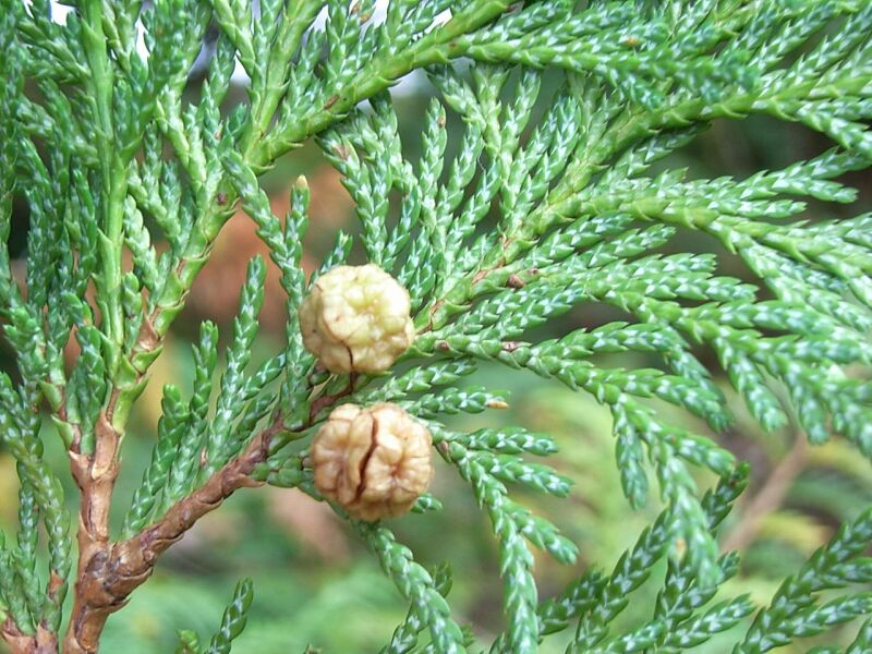 アスナロ:葉は幅広で粗く先とがらず、白い気孔帯が4本あり、果鱗に突起。