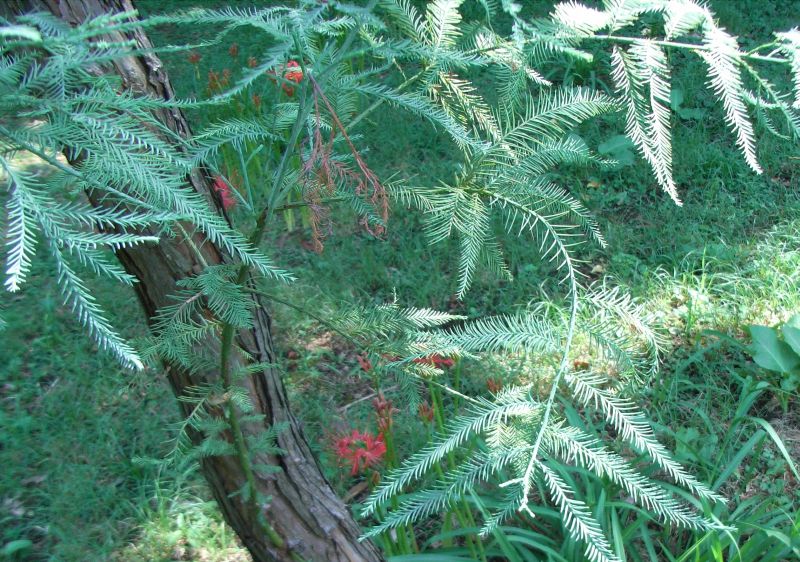 樹皮は褐色で、枝は下垂し、葉は針形で、ラクウショウとちがって秋に落葉しない