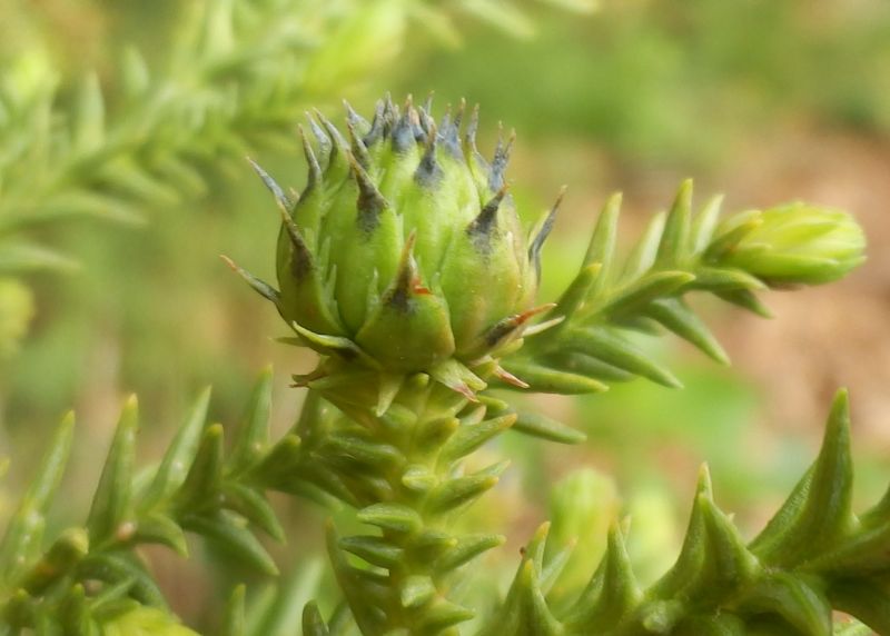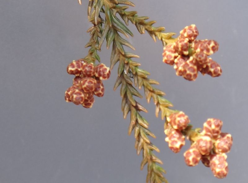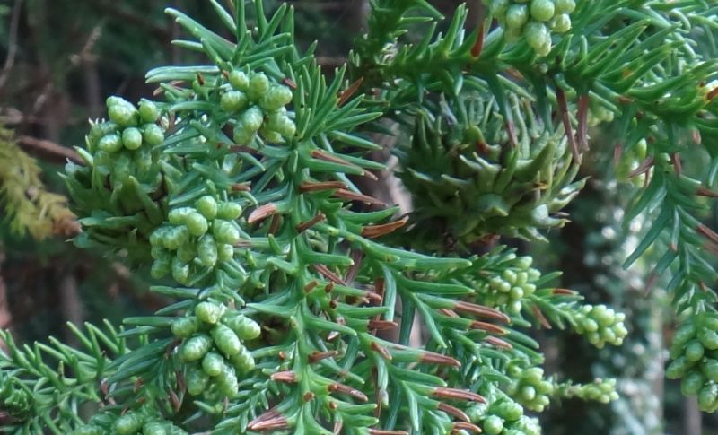 枝先に単生している淡黄緑色で針山状のが雌花、淡褐色で楕円状のは雄花序。