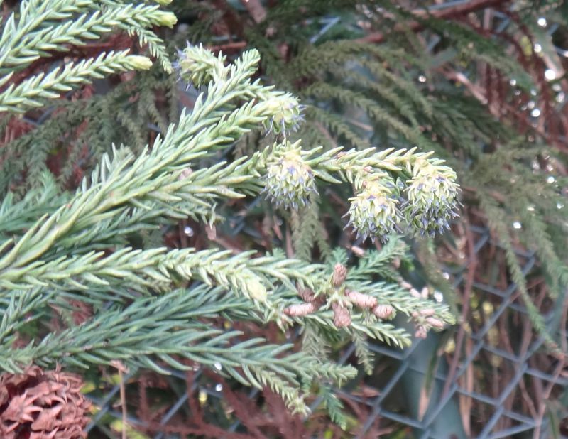 雌花は緑色の球形で枝先に横向き〜下向きにつく。