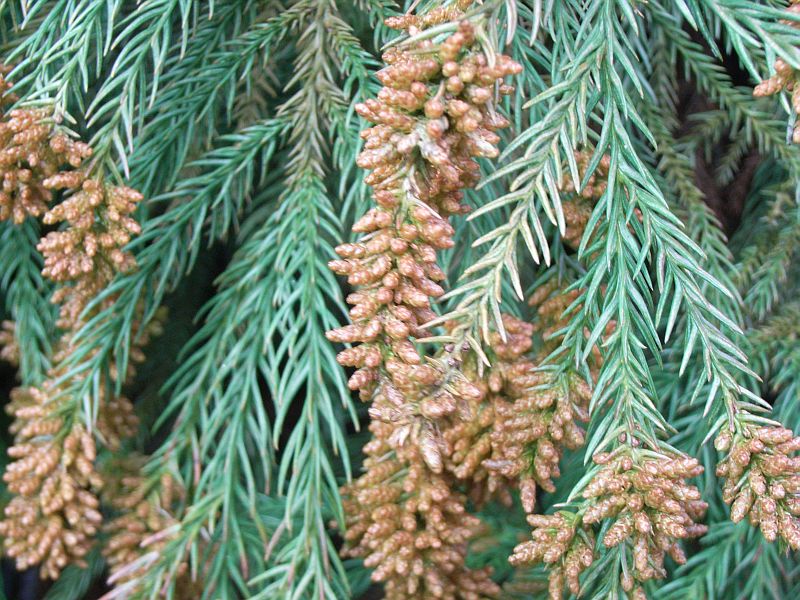 雄花は淡黄色の楕円形で枝先に総状に群生し、大量の花粉を飛ばす。