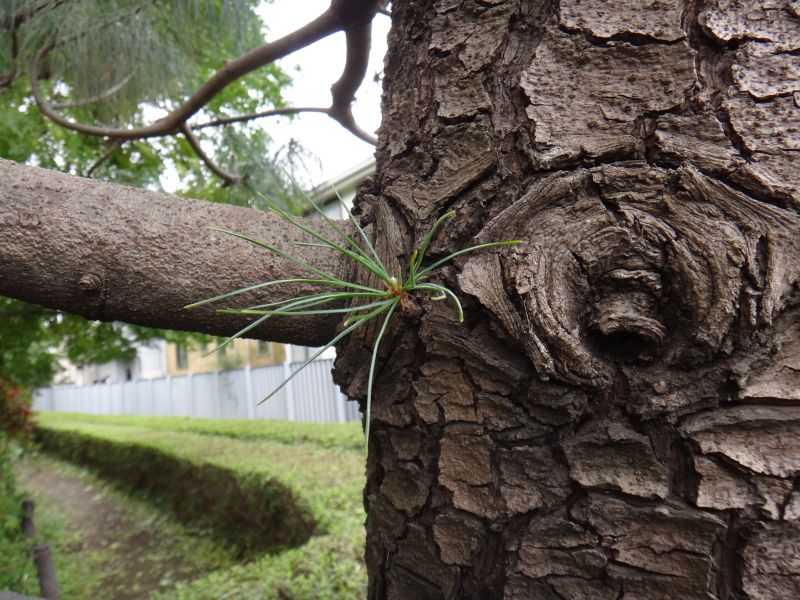 樹皮は灰褐色で、四角い鱗状に不規則にひび割れる。