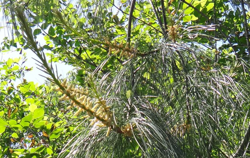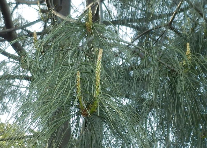 雄花序は淡褐色の長楕円形で、若枝の下部にらせん状につく。
