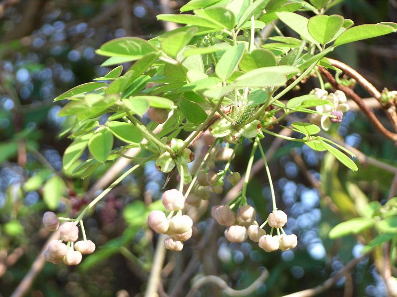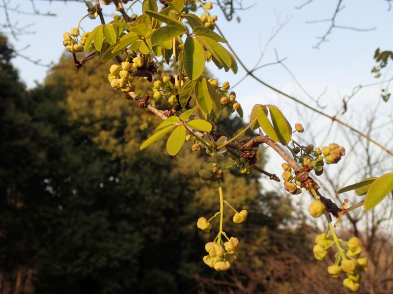 葉腋から短い総状花序をぶら下げ、先端に雄花、基部に雌花がつく。