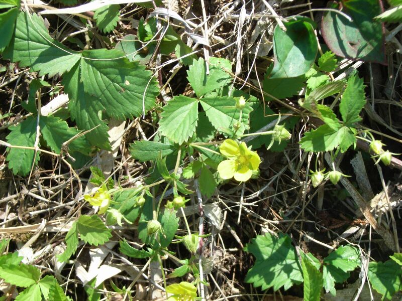 長い匐枝で広がり、葉に粗鋸歯があり、黄色い花の基部の色が濃い