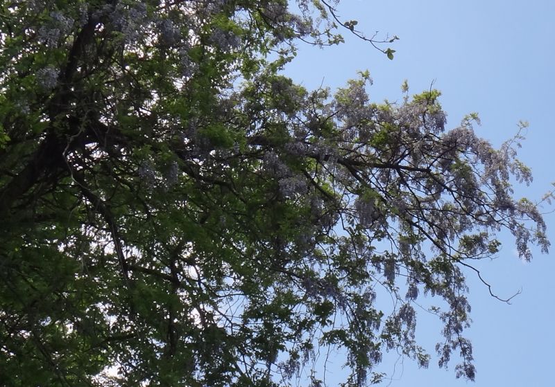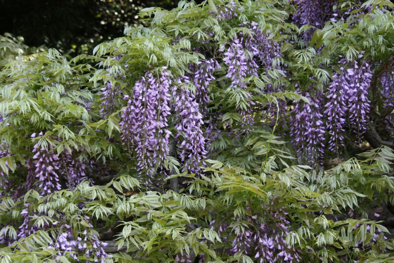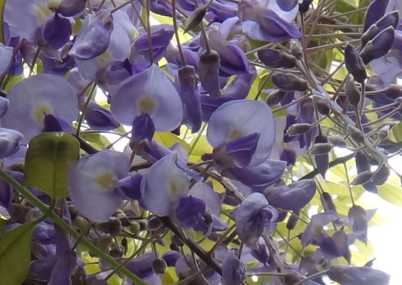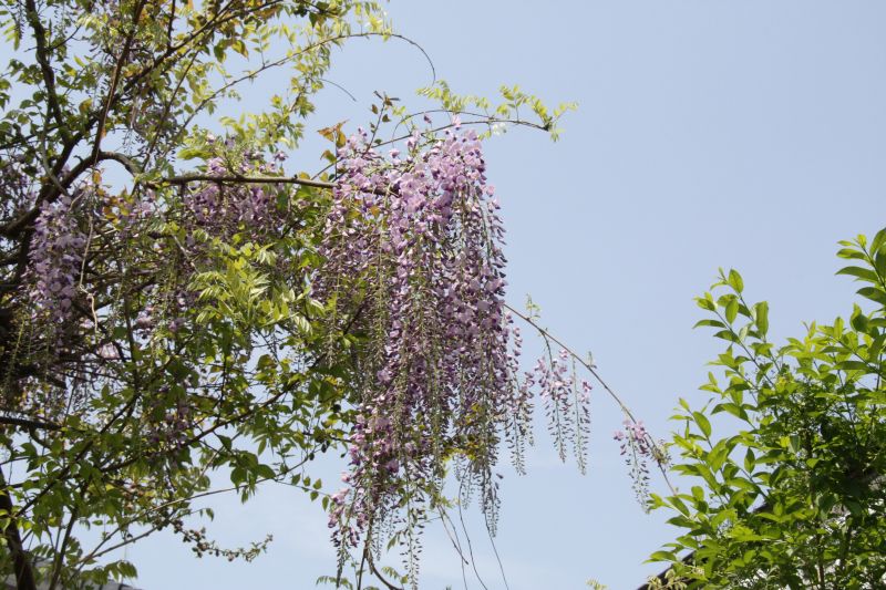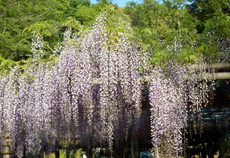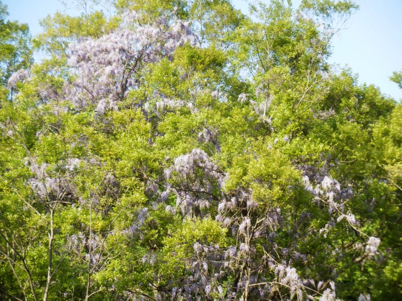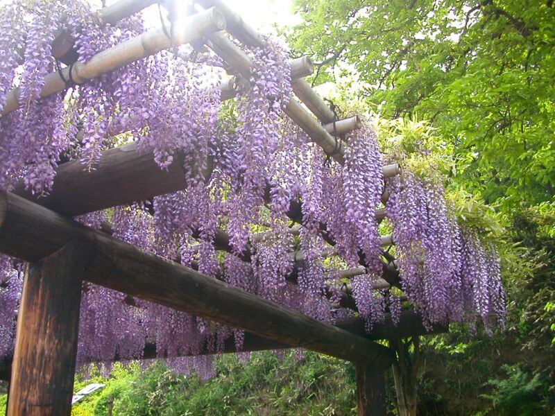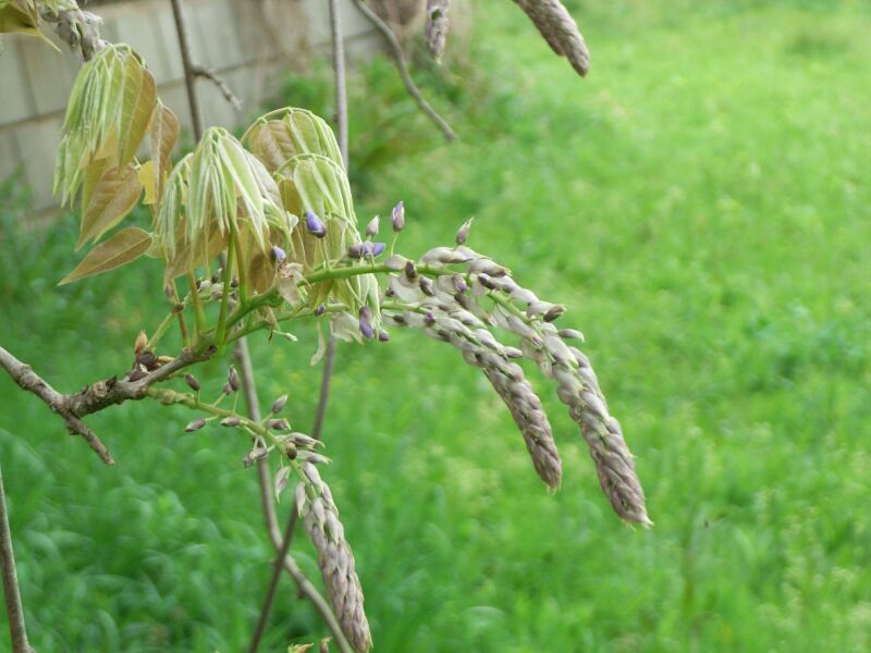 フジ :つる左巻、花期5月、花序20〜100センチ、花紫色、小葉5〜9対、葉裏に毛少ない。