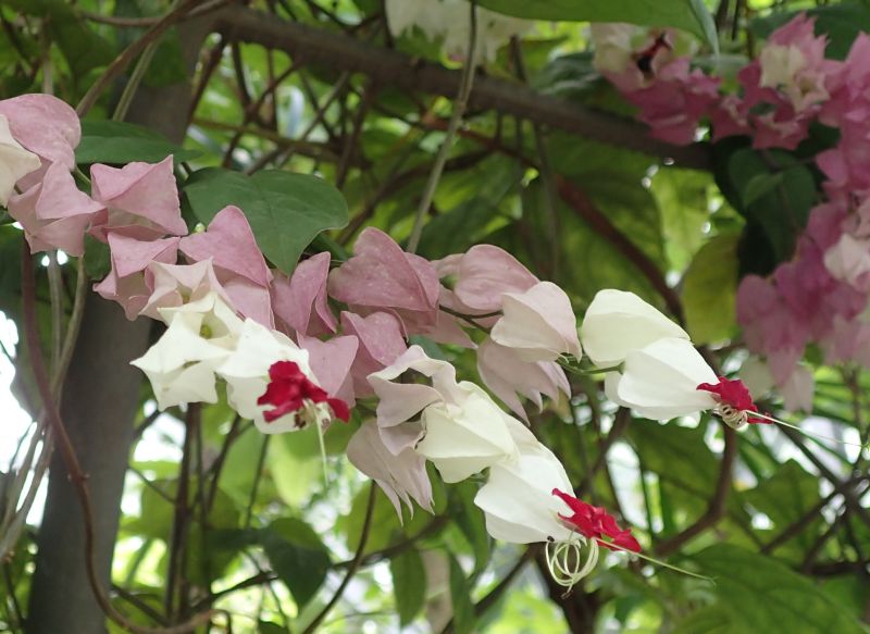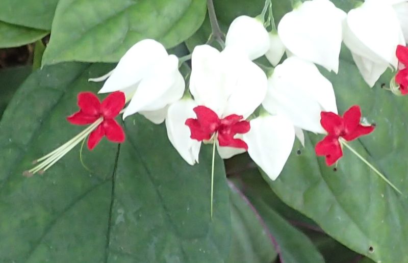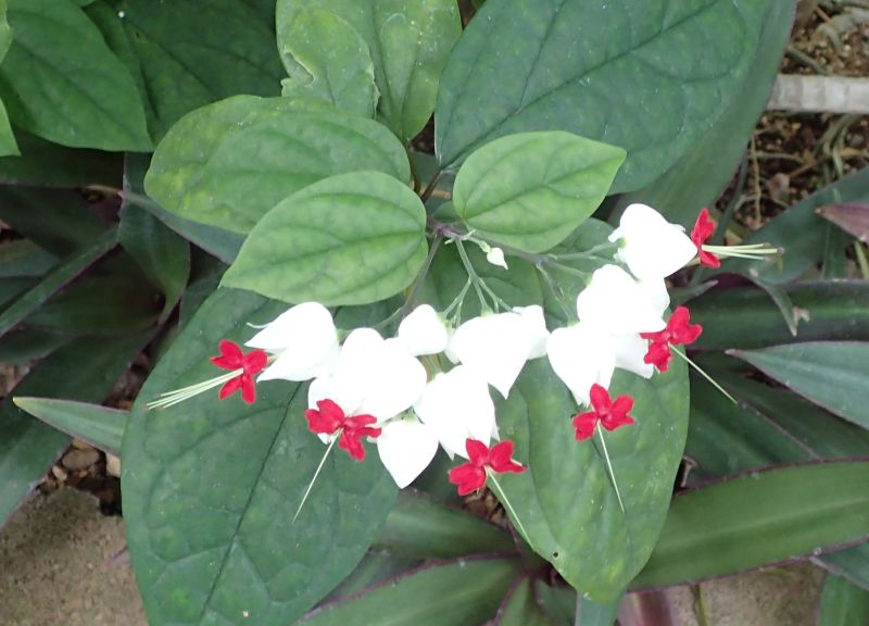 白い萼と赤い花弁を持つ花をつける。