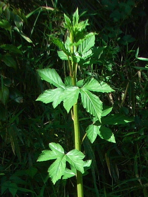 葉は互生し、掌状に3〜7裂し、重鋸歯があって、裏面はやや粉白色を帯びる。