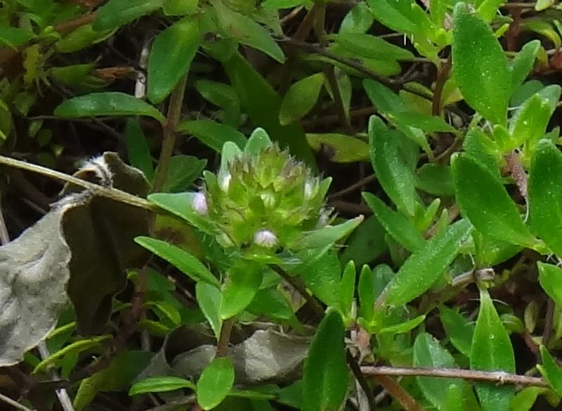 長さ5〜8ミリの紅紫色の唇形の花を頭状につける。