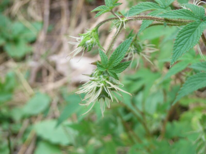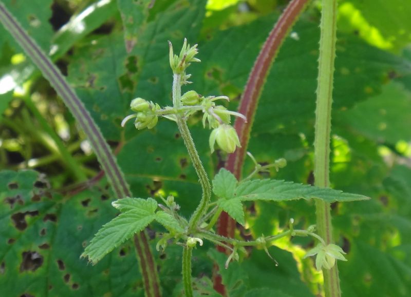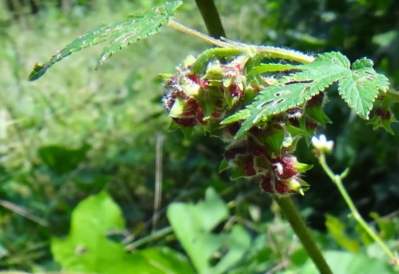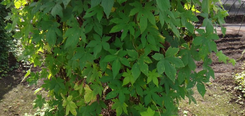 葉は対生し、長さは5〜12センチで、掌状に5〜7深裂して鋸歯があり、