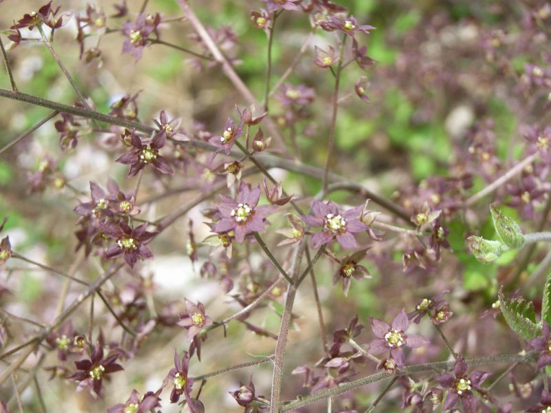 花序枝の長い円錐花序に小さい暗紫色の花を平開させる