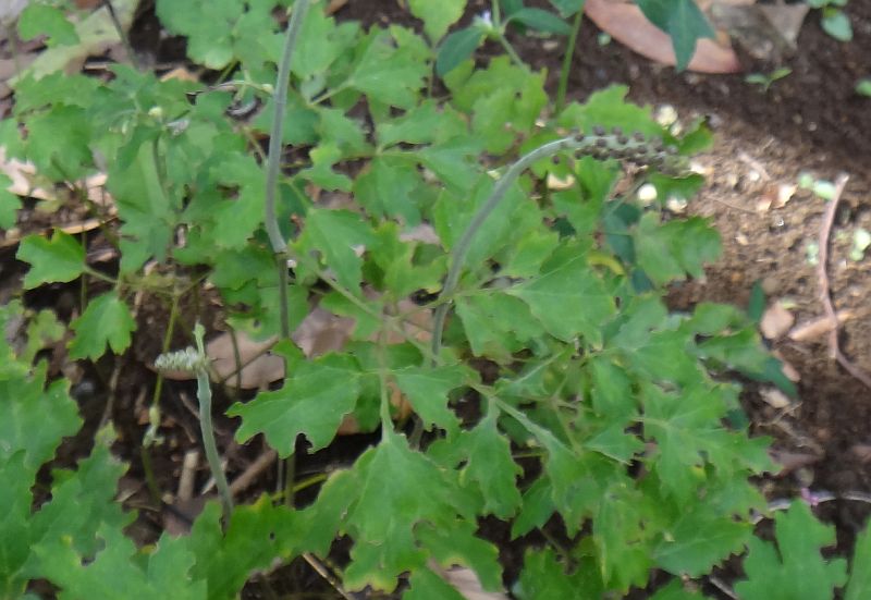 両面とも葉脈に短毛があリ、茎先に柄のない小さい白い花をブラシ状に多数つける