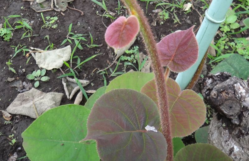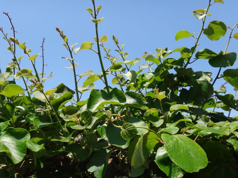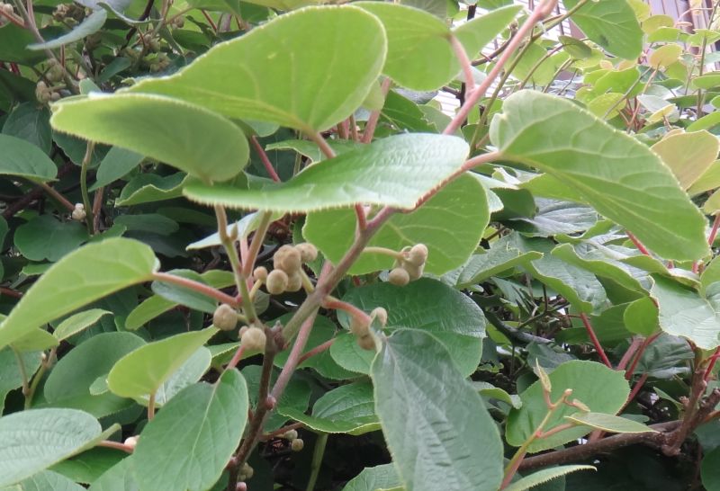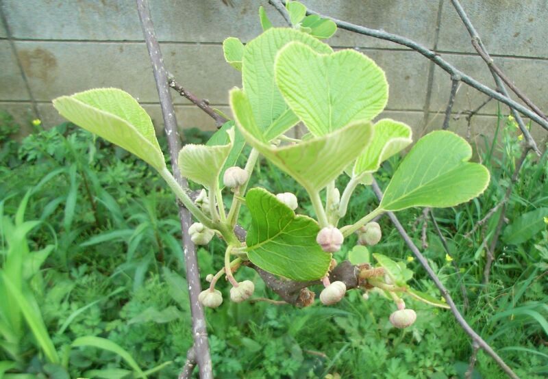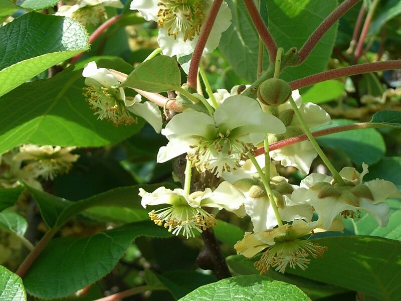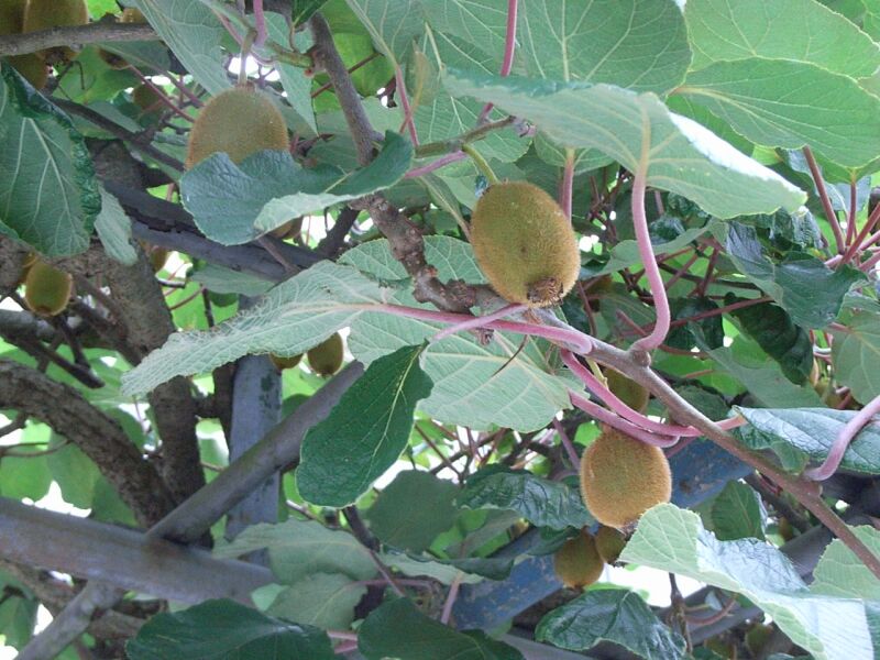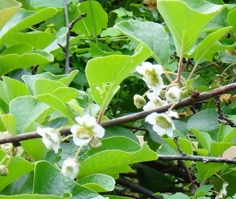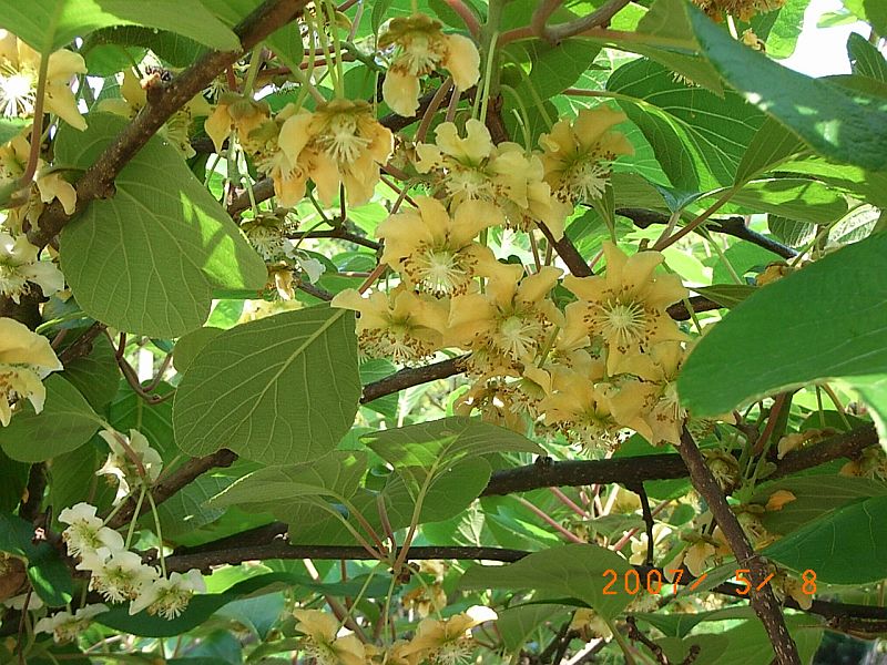 キウィフルーツ:樹皮灰白色で平滑、花数少、葯が黄色、果実は約8センチ、褐色、毛あり。