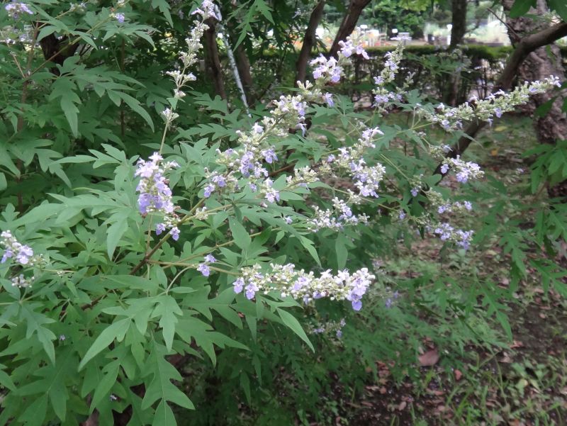 円錐花序に小さい淡紫色の唇形花を多数つける