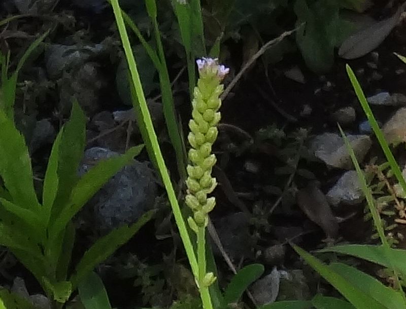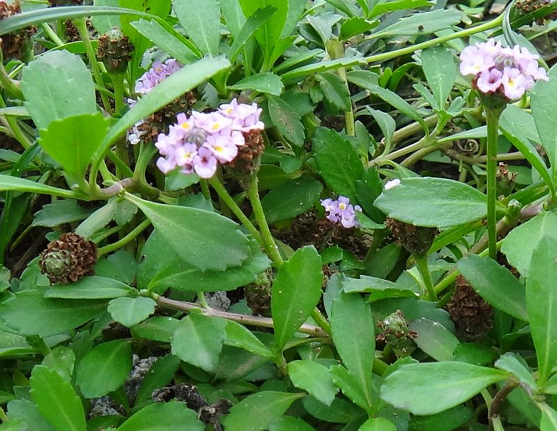 葉は地面を覆い、円柱状に成長する花序に紅紫色で5裂した小さい花を密につける