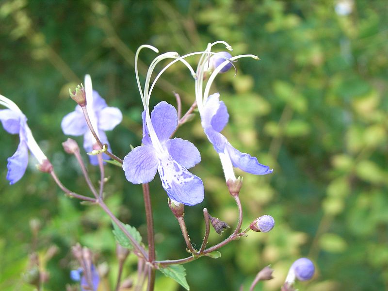 集散花序に淡青紫色で花冠が5裂し雄しべと花柱の突出した
