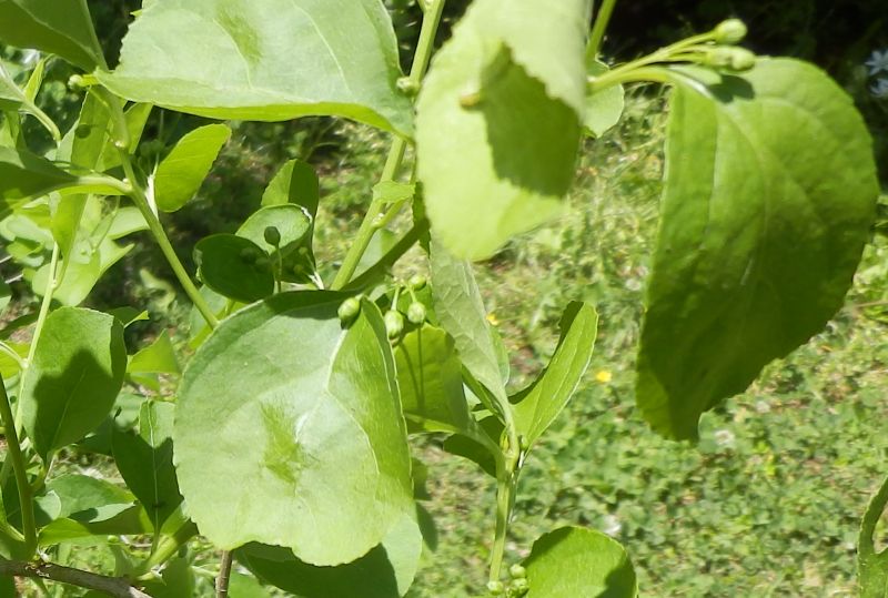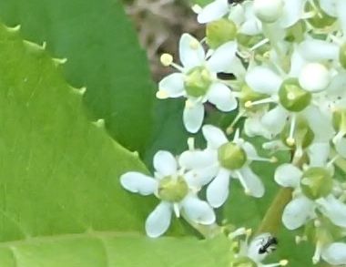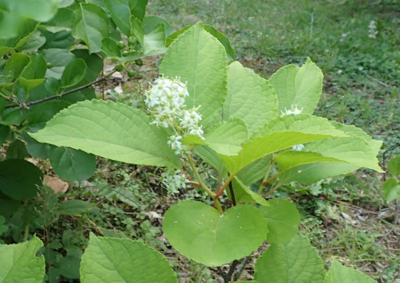 夏に緑白色の小さい花を枝先の円錐花序に多数つける。