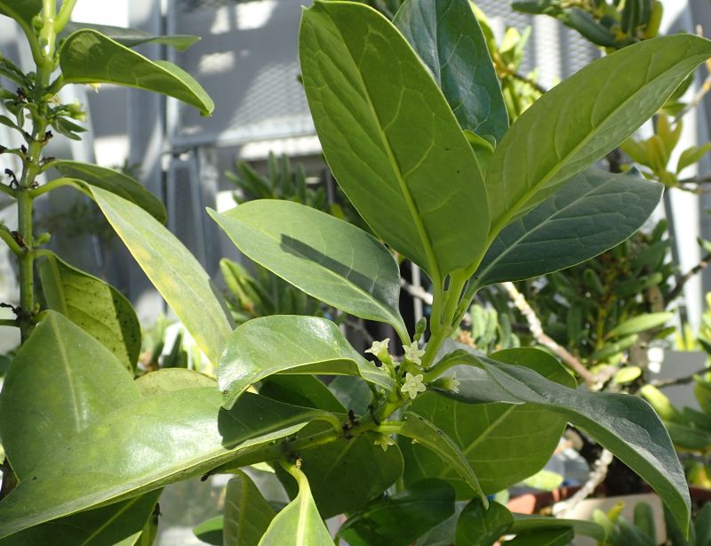 樹皮は灰褐色、葉は全縁革質の楕円形で、漏斗状の花の花冠が5裂する