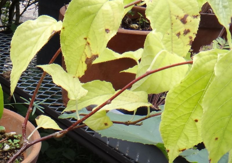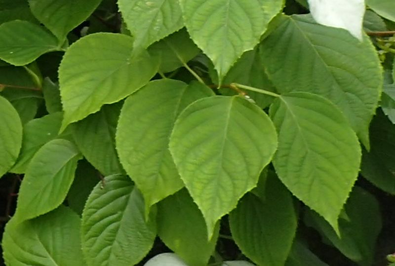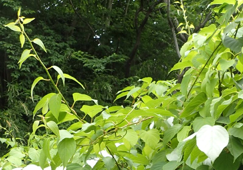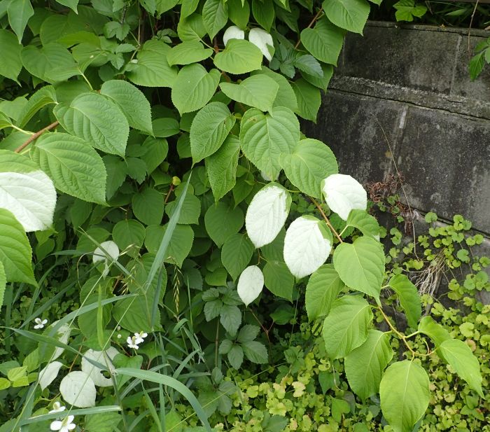 上部の葉は花期に表が白くなるが、実のなるころにはまた緑にもどる。