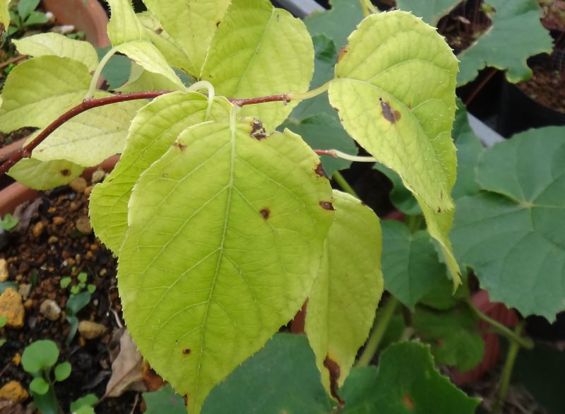 枝は紫黒色で、つる状に長くのび、若枝には細毛がある。