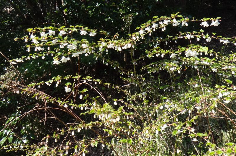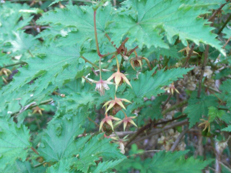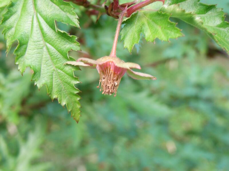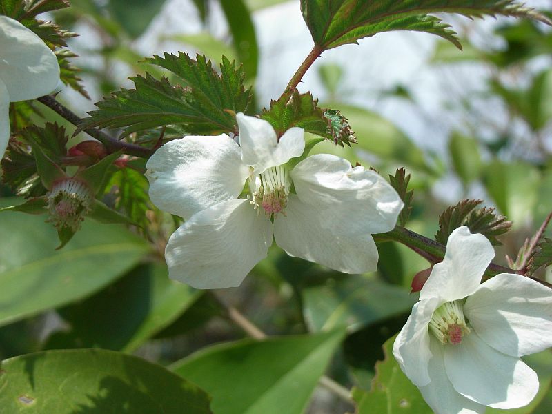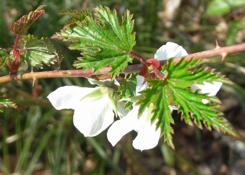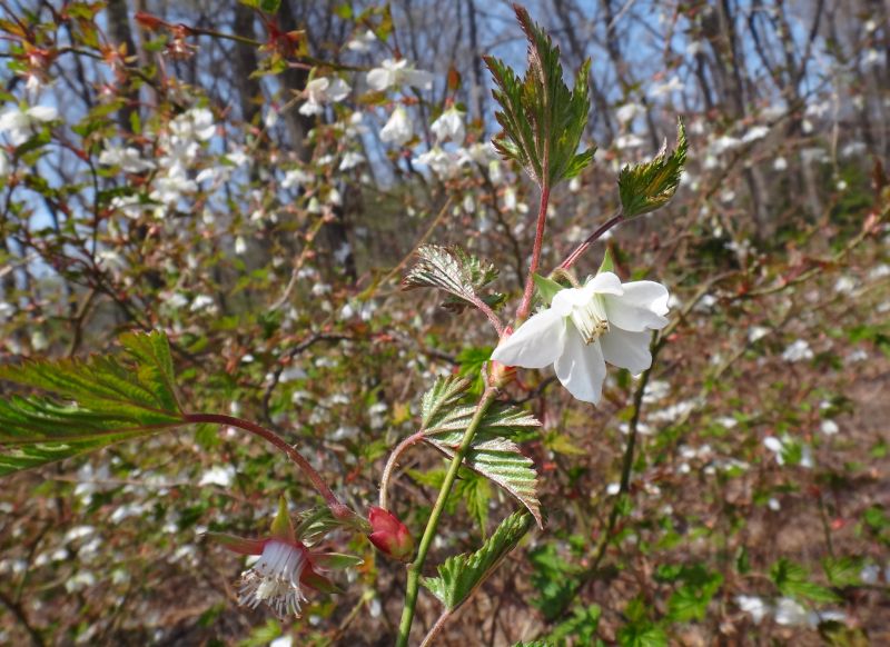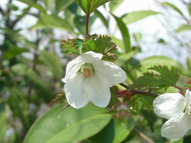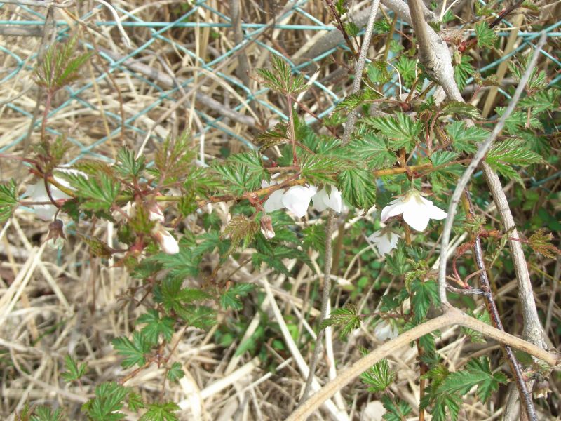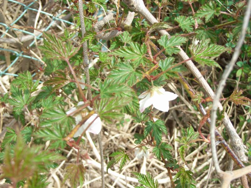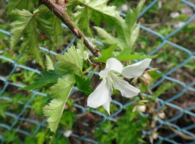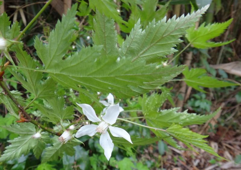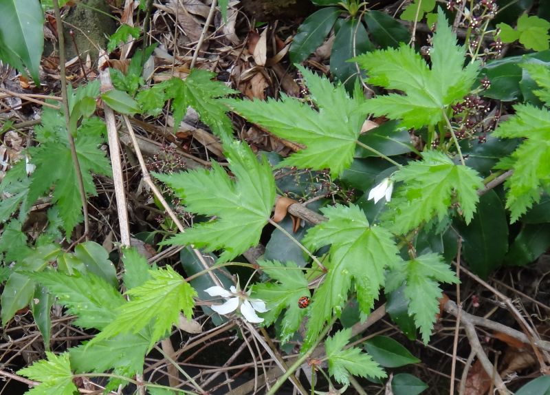 春に葉腋に5弁の白い花が1つ下向きに咲く。葉の裂片に粗い鋸歯がある。