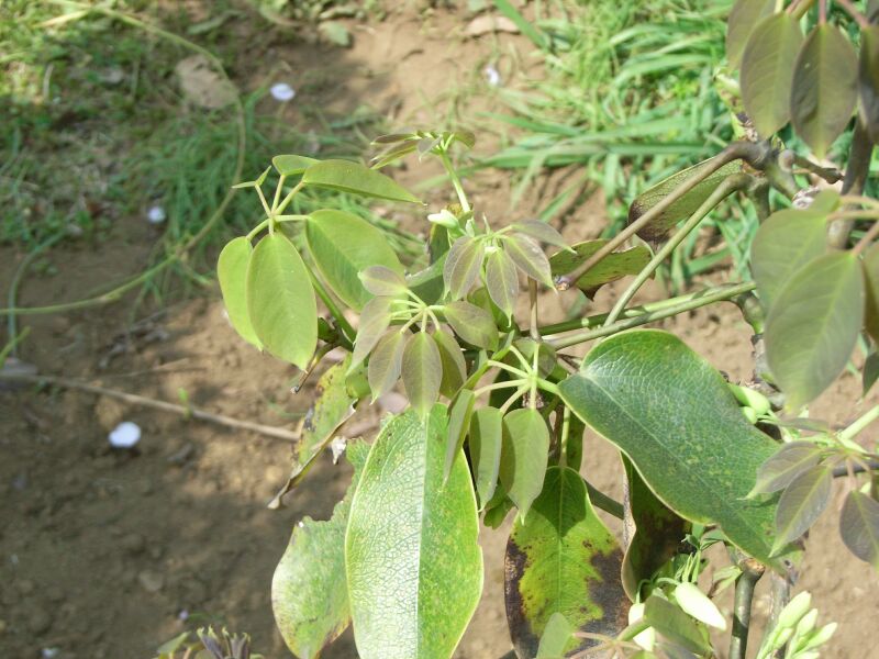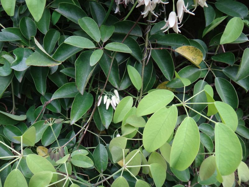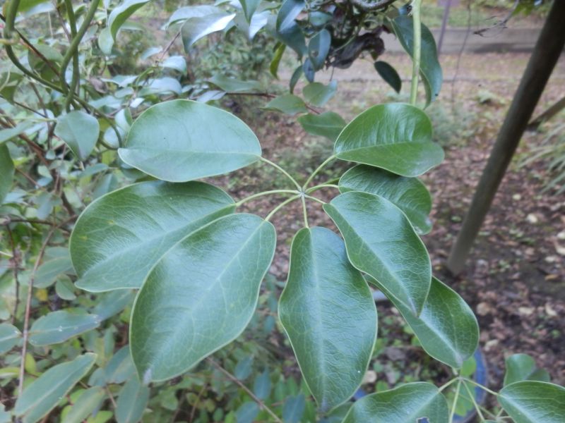 掌状複葉が互生し、長さ5〜10センチの小葉が5〜7個つく。
