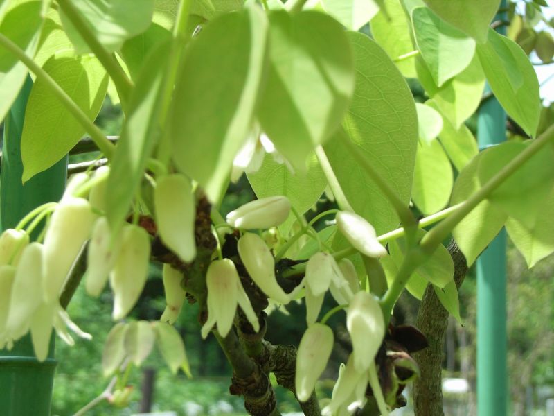 春に葉腋から総状花序を斜上させ、淡黄白色の花を3〜7個つける。雌雄同株。