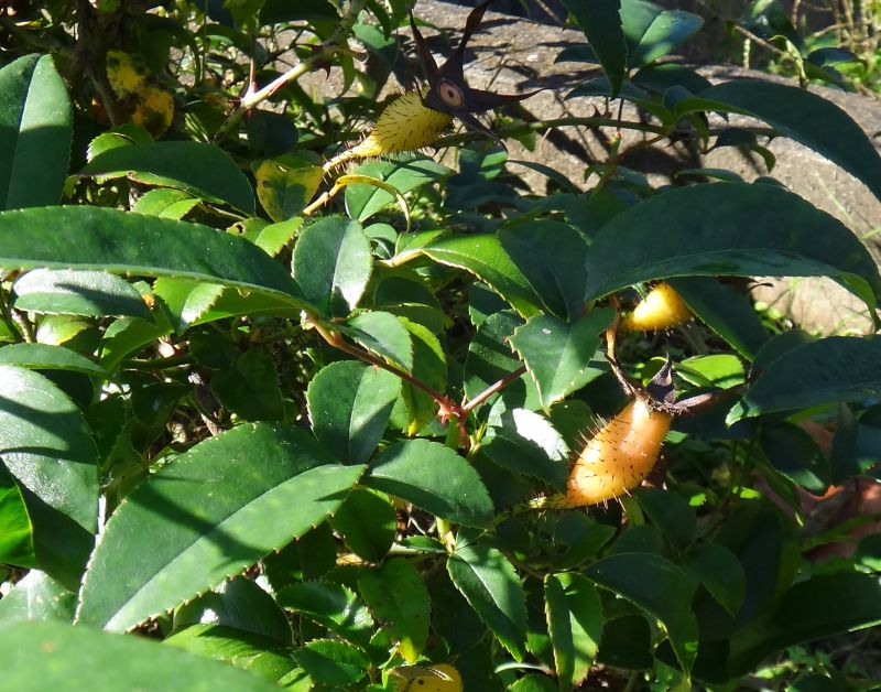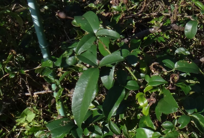 楕円形で光沢があり、葉柄に細かい棘がある。