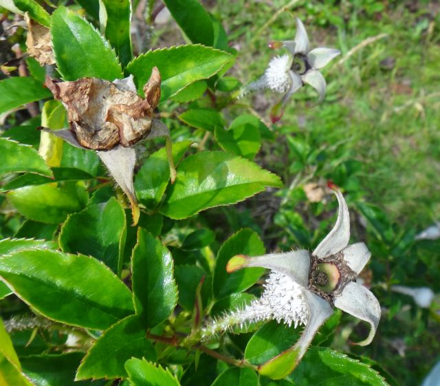 萼筒や花柄に小さい棘が密生する。多数の黄色い雄しべがある。