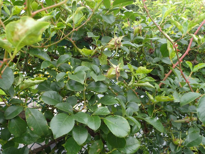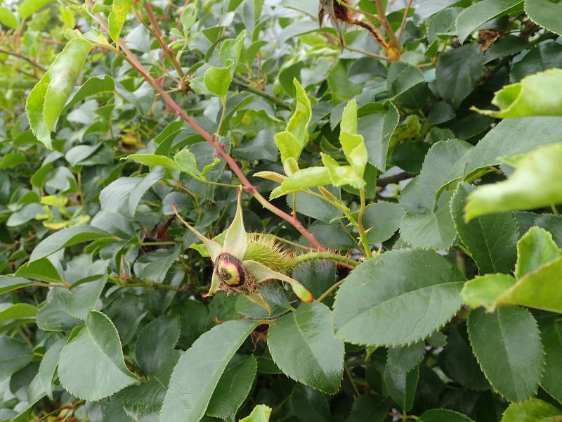 楕円形で棘の密生した偽果が秋に暗橙赤色に熟す。