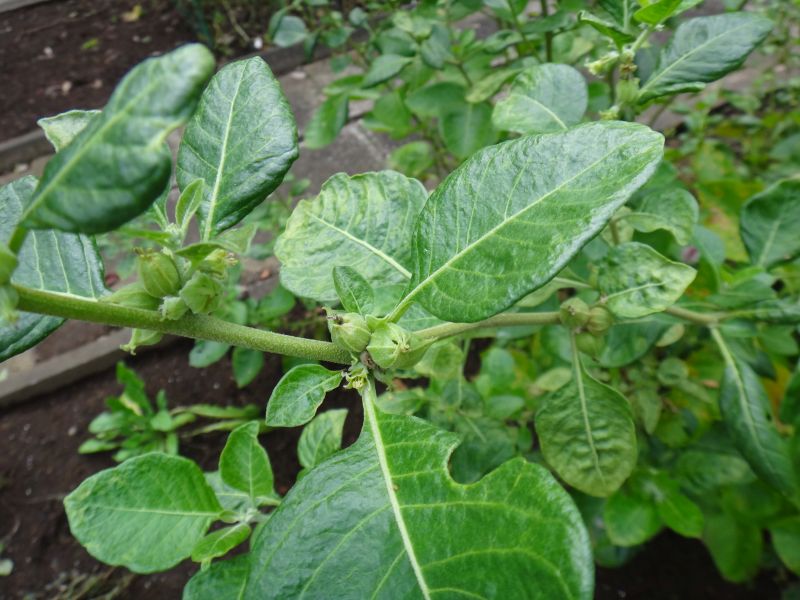 葉は卵形、花は赤紫色の釣鐘形で、丸い液果が黒熟する毒草