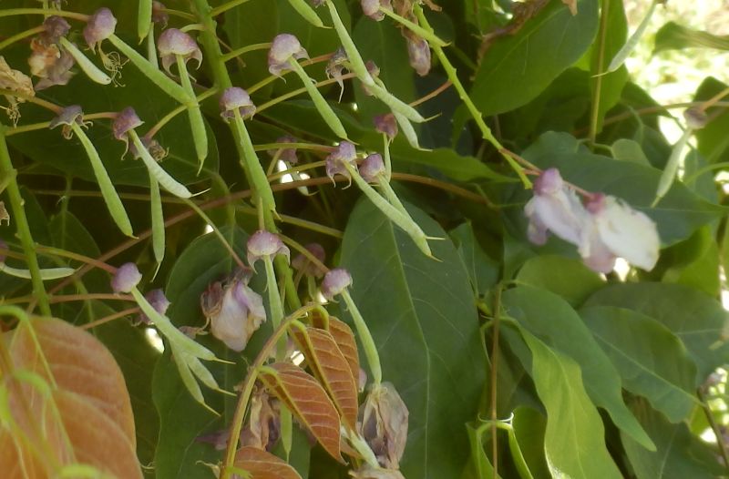長さ10〜15センチの豆果がぶら下がり、熟すと2つに割れて、